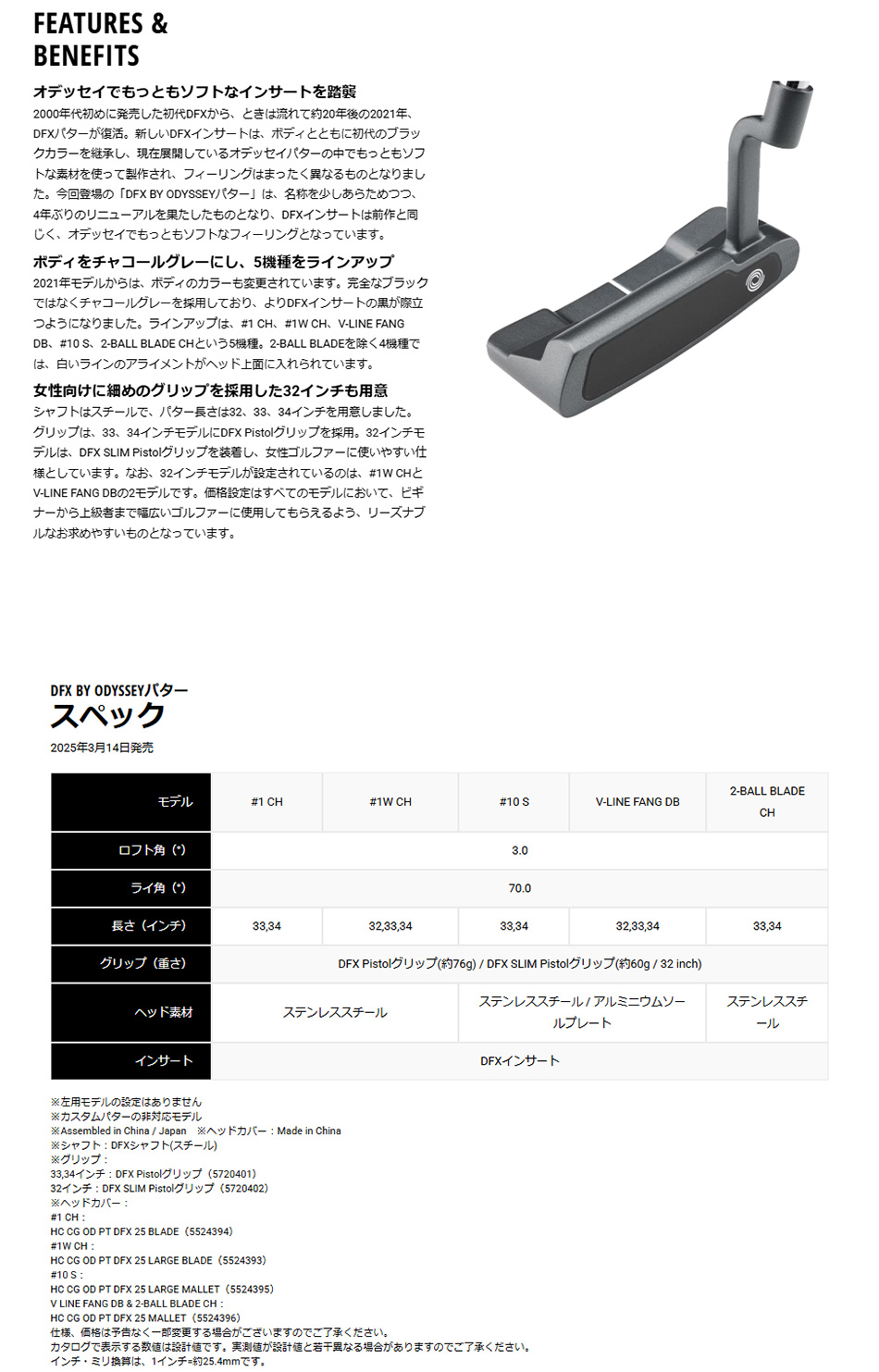 シャフトはスチールで、パター長さは32、33、34インチを用意しました。グリップは、33、34インチモデルにDFX Pistolグリップを採用。32インチモデルは、DFX SLIM Pistolグリップを装着し、女性ゴルファーに使いやすい仕様としています。なお、32インチモデルが設定されているのは、#1W CHとV-LINE FANG DBの2モデルです。価格設定はすべてのモデルにおいて、ビギナーから上級者まで幅広いゴルファーに使用してもらえるよう、リーズナブルなお求めやすいものとなっています。