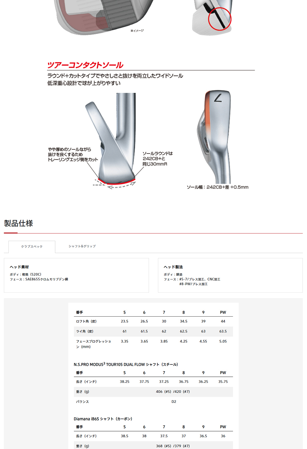 | ロフト角 | 5I:23.5° 6I:26.5° 7I:30° 8I:34.5° 9I:39° PW:44° |