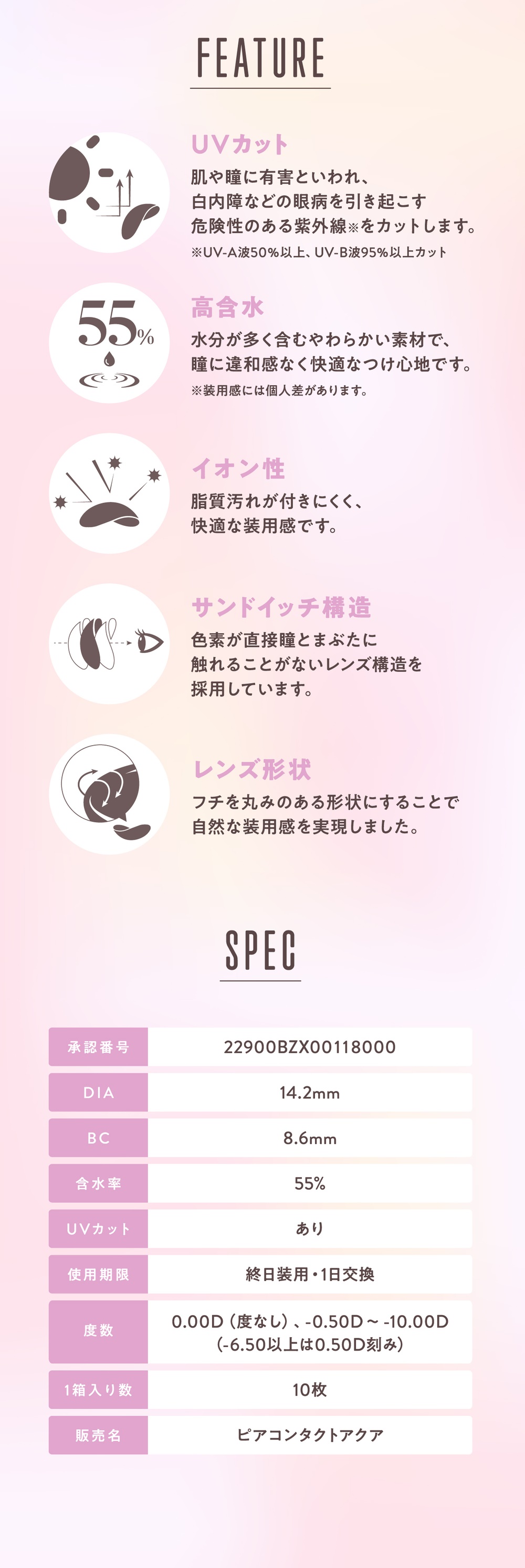 水分が多く含むやわらかい素材で、瞳に違和感なく快適なつけ心地です。
