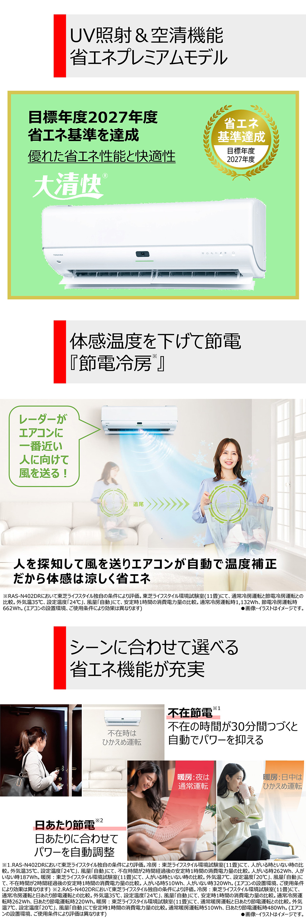 お部屋に不在の時間が30分間つづくと自動でパワーを抑え、電気のムダをカットします。