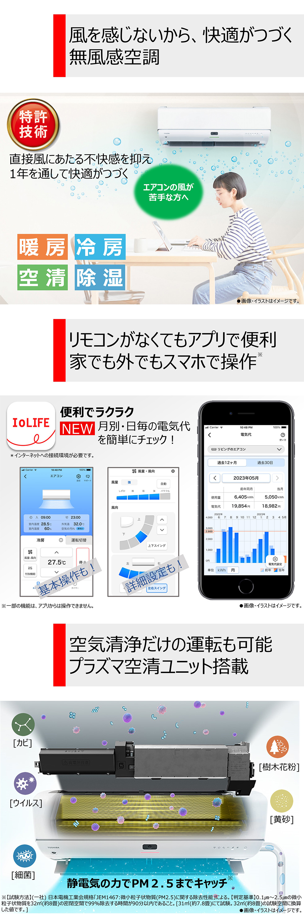 温度を上げる補正を行いながら、レーダーでエアコンに一番近い人に風を送ることで体感温度は涼しく感じ、消費電力を抑えることができます。