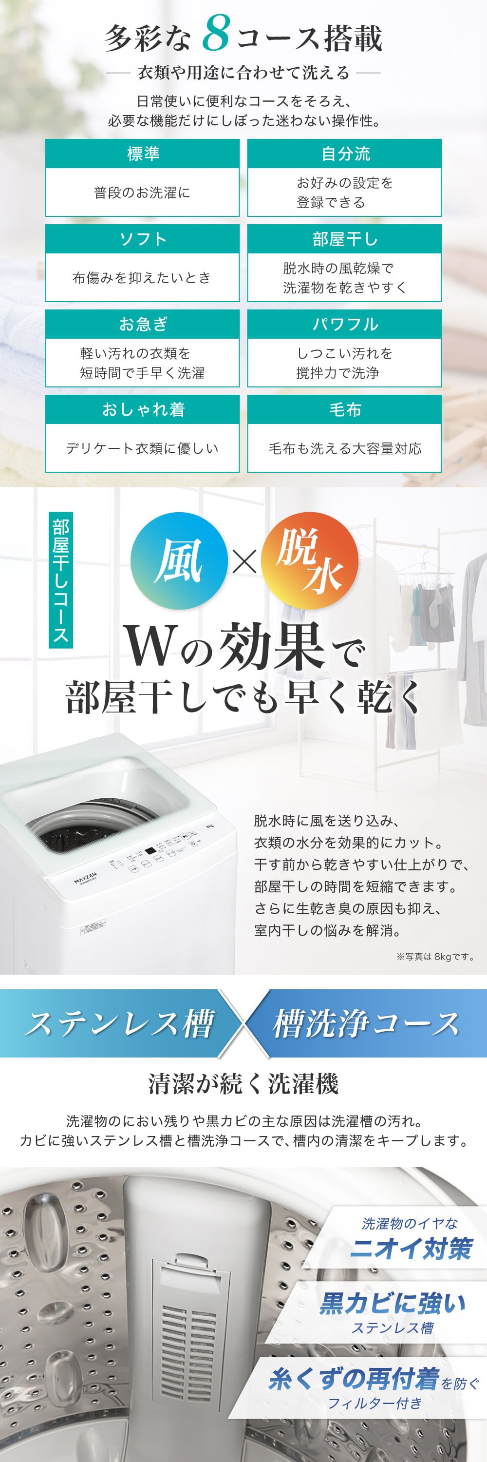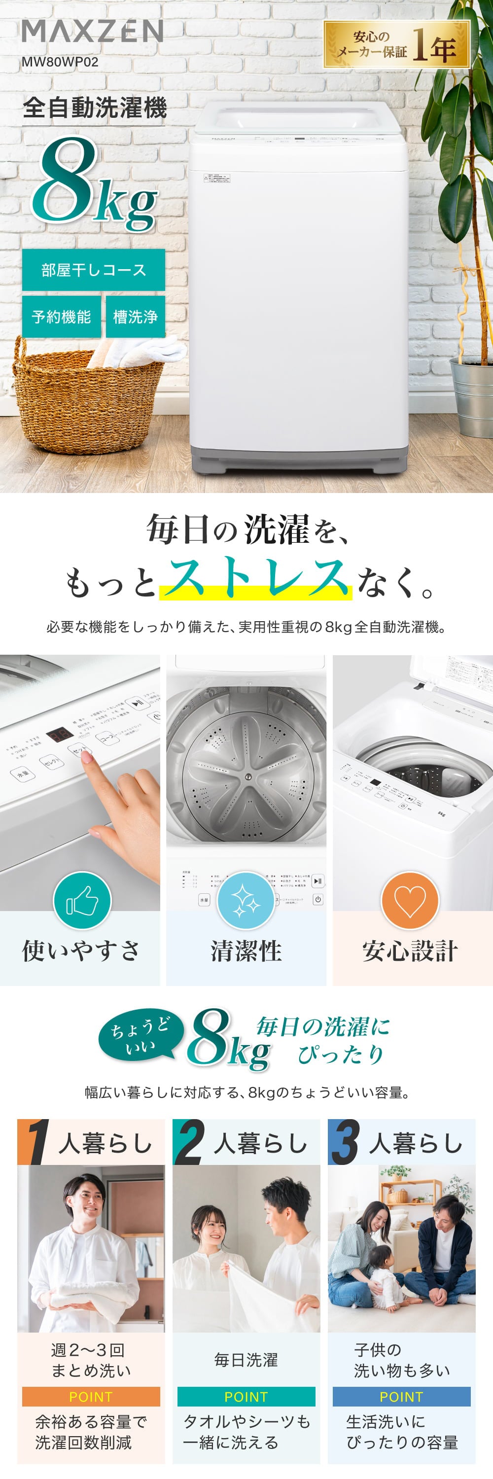 ★ ちょうどいい8kg 毎日の選択にぴったり。幅広い暮らしに対応する、8kgのちょうどいい容量。