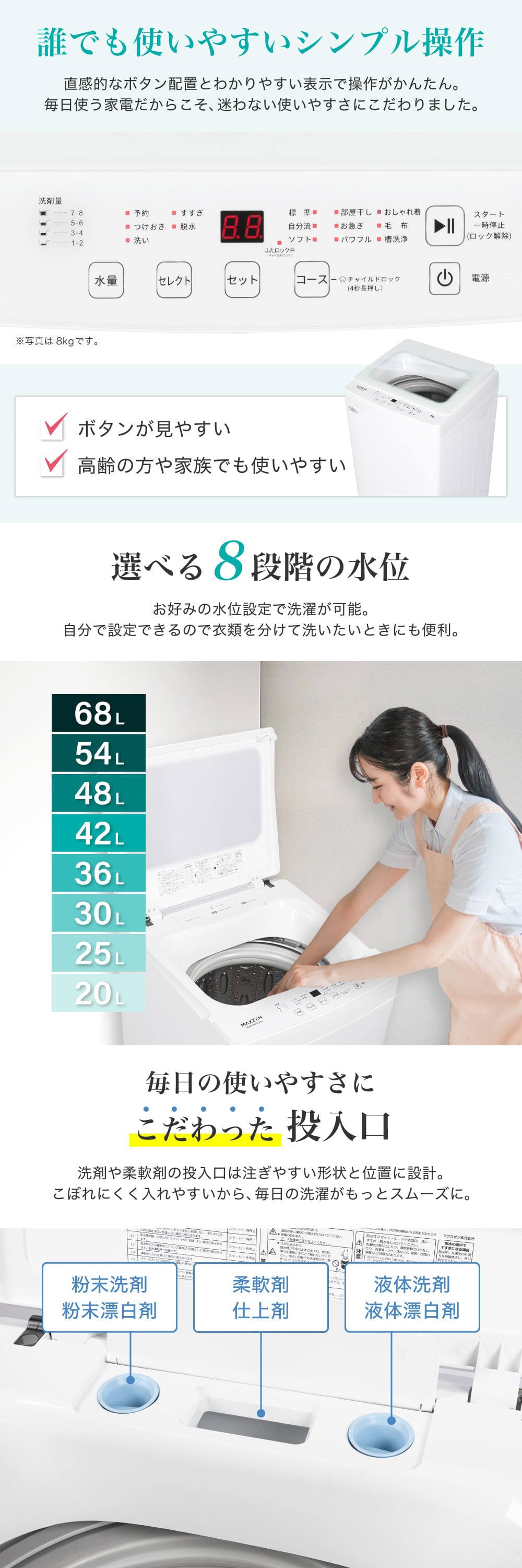 洗剤や柔軟剤の投入口は注ぎやすい形状と位置に設計。こぼれにくく入れやすいから、毎日の洗濯がもっとスムーズに。
