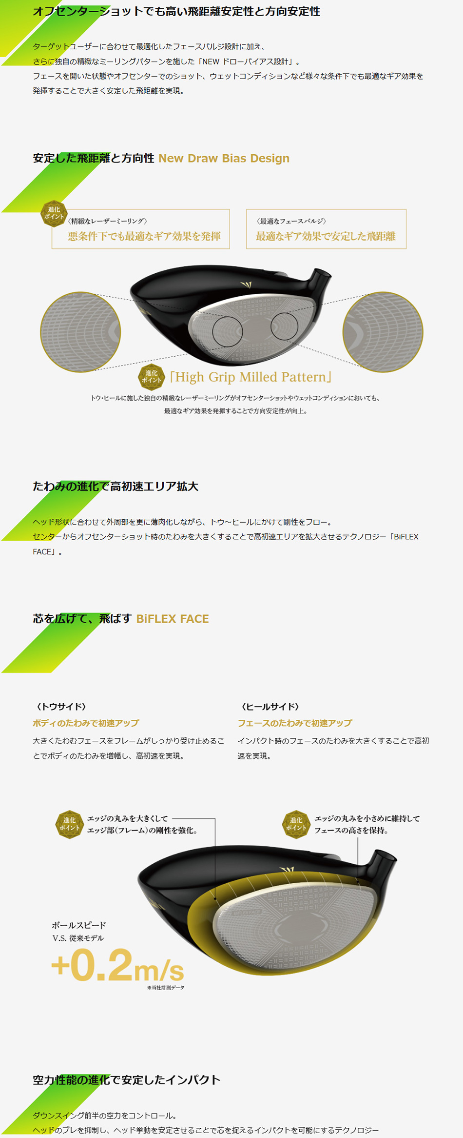 センターからオフセンターショット時のたわみを大きくすることで高初速エリアを拡大させるテクノロジー「BiFLEX FACE」。