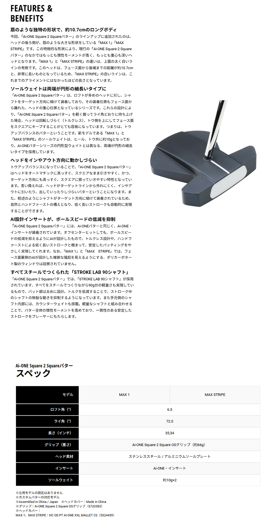 「Ai-ONE Square 2 Squareパター」は、ロフトが多めのヘッドに対し、シャフトをターゲット方向に傾けて装着しており、その装着位置もフェース面から離れた、ヘッドの重心位置となっているシリーズです。これらの設計により、「Ai-ONE Square 2 Squareパター」を軽く握ってライ角どおりに持ち上げた場合、ヘッドは回転しづらく(トルクレス)、トウ側を上にしてフェース面をスクエアにキープすることがとても容易になっています。つまりは、トウアップバランスのパターということです。新モデルである「MAX 1」と「MAX STRIPE」のソールウェイトは、ヒール、トウ共に約10gとなっており、Ai-ONEパターシリーズの円形型ウェイトとは異なる、両端が円形の細長いタイプを採用しています。
