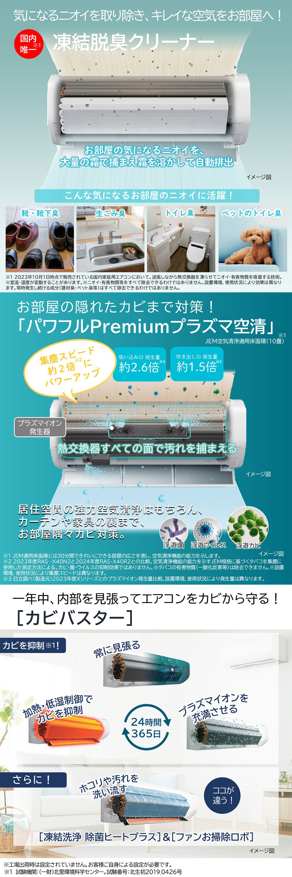 ※1.試験機関: (一財)北里環境科学センター。試験番号: 北生発2019_0426号。室温約27℃、湿度約70%。【シーズン中を想定した試験動作】[カビバスターなし]: 毎日6時間冷房運転を3週繰り返し。[カビバスターあり]: 毎日6時間冷房運転後、1~3日目までは[カビバスター]設定によるエアコン内部乾燥運転。4日目は[カビバスター]運転(加熱・低湿制御)、5・6日目は[カビバスター]設定によるエアコン内部乾燥運転、7日目は[カビバスター]運転(加熱・低湿制御)+[凍結洗浄]運転。このサイクルを3週繰り返し。【シーズンオフを想定した試験動作】[カビバスターなし]: 1日目のみ6時間冷房運転後、3週間運転停止。[カビバスターあり]: 1日目のみ6時間冷房運転後、4、8、12、16、20日目は定刻1回[カビバスター]運転(加熱・低湿制御)。【吐出空気のカビ個数の比較】対象部分: 熱交換器・通風路・ファンにカビ胞子を塗布し、上記運転を3週繰り返し後の吹き出す空気を採取。1m3当たりの空気に含まれるカビ胞子個数を比較。99%以上低減。