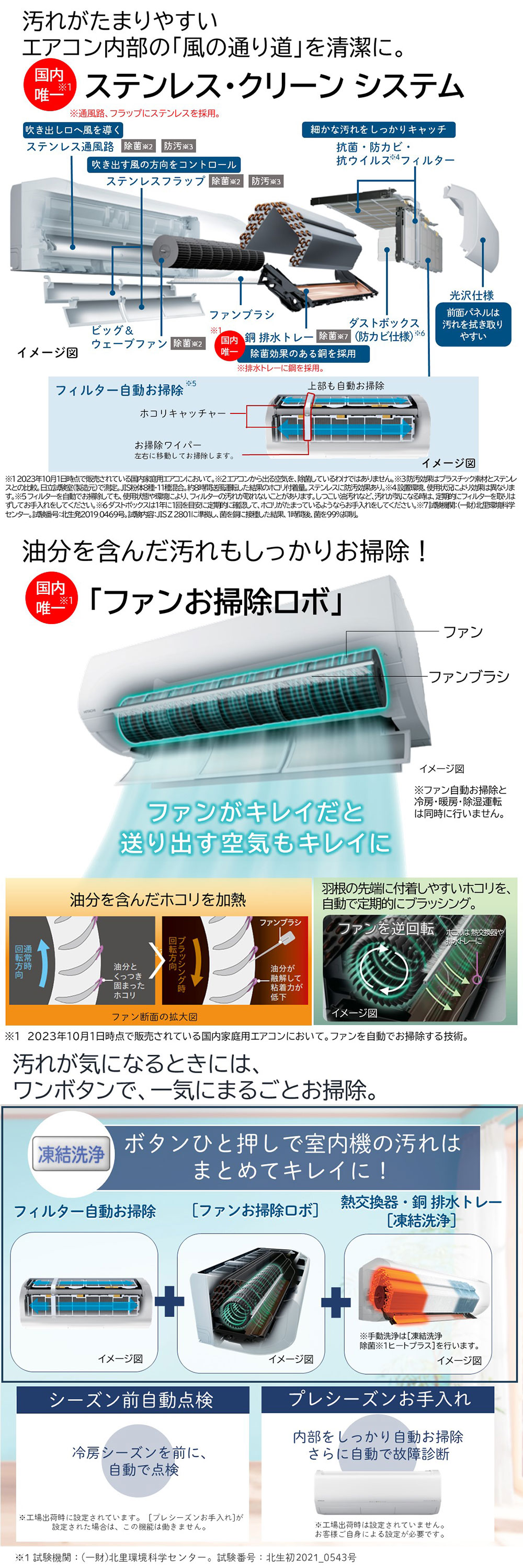 ※2.防汚効果はプラスチック素材とステンレスとの比較。日立試験室(製造元)で測定。JIS粉体8種・11種混合。約8時間送風運転した結果のホコリ付着量。ステンレスに防汚効果あり。