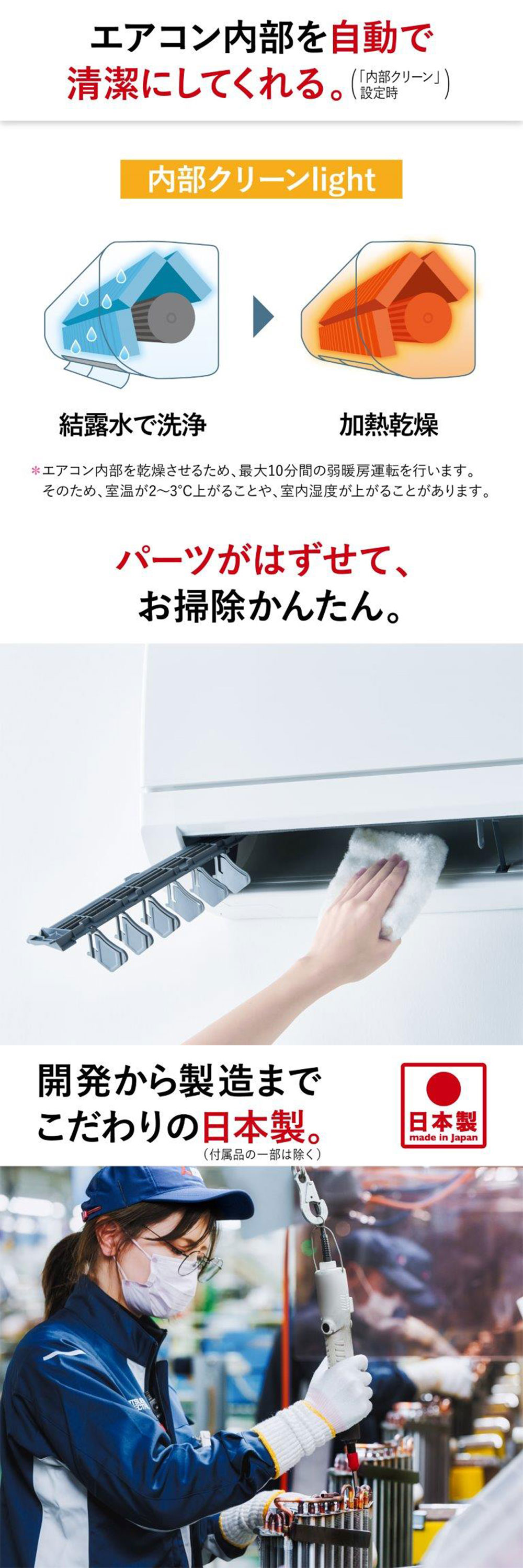 はずせるボディ:エアコンの前面パネルやフラップなどのパーツを取り外して奥までお掃除らくらく。
