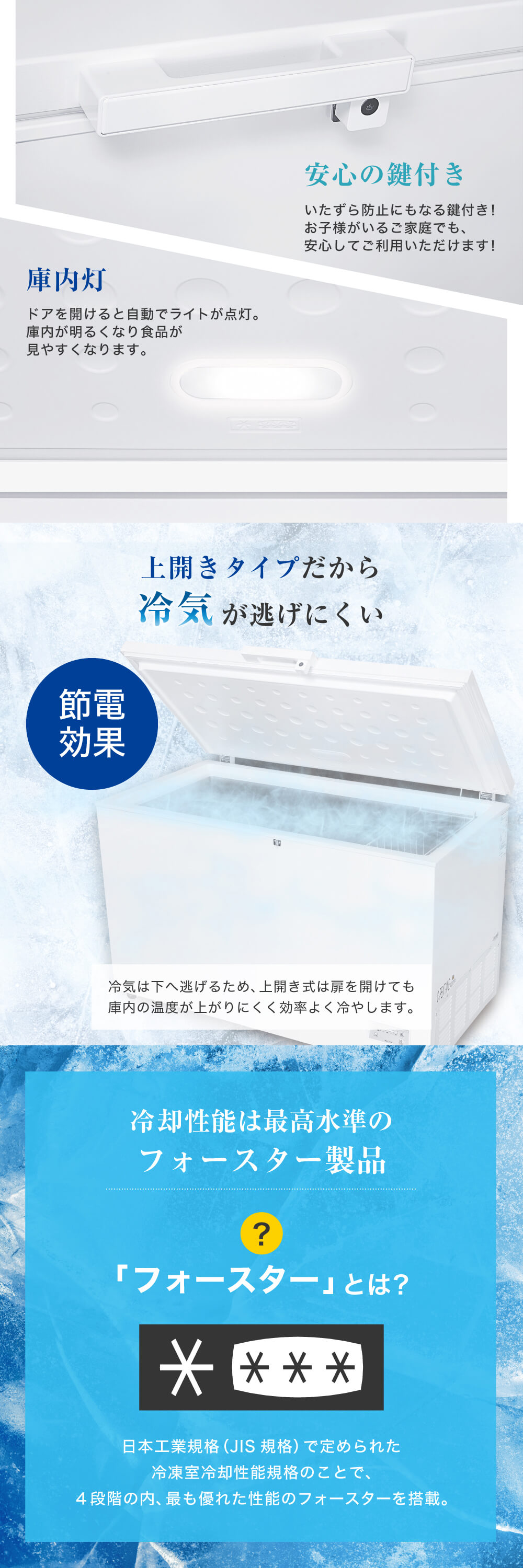 日本工業規格(JIS規格)で定められた冷凍室冷却性能規格のことで、4段階の内、最も優れた性能のフォースターを搭載。