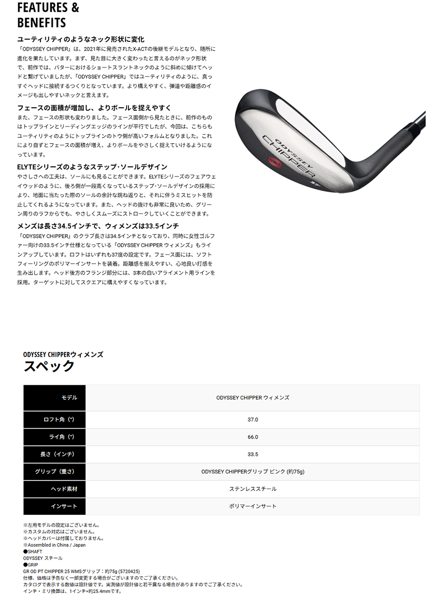 「ODYSSEY CHIPPER」のクラブ長さは34.5インチとなっており、同時に女性ゴルファー向けの33.5インチ仕様となっている「ODYSSEY CHIPPER ウィメンズ」もラインアップしています。ロフトはいずれも37度の設定です。フェース面には、ソフトフィーリングのポリマーインサートを装着。距離感を揃えやすい、心地良い打感を生み出します。ヘッド後方のフランジ部分には、3本の白いアライメント用ラインを採用。ターゲットに対してスクエアに構えやすくなっています。