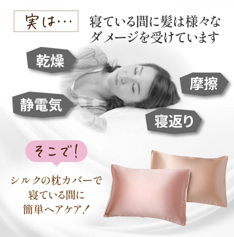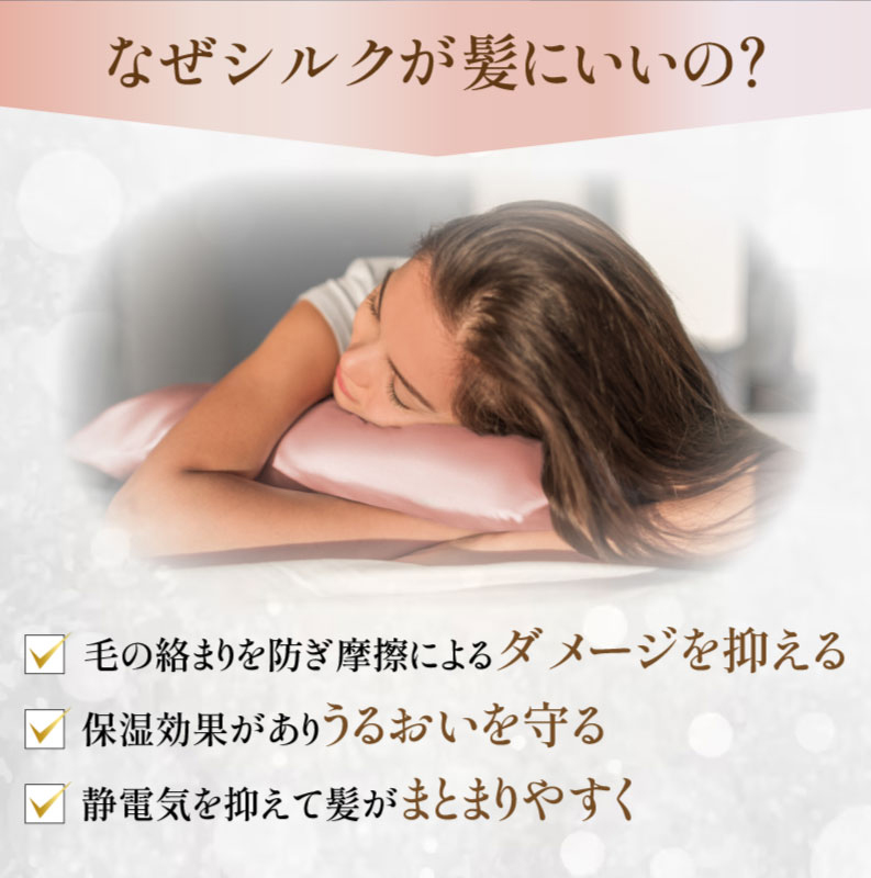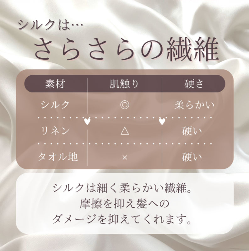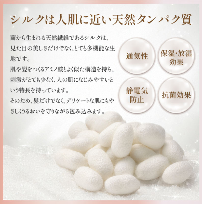 なめらかな肌触りのシルクは肌や髪に大変優しい使い心地です
