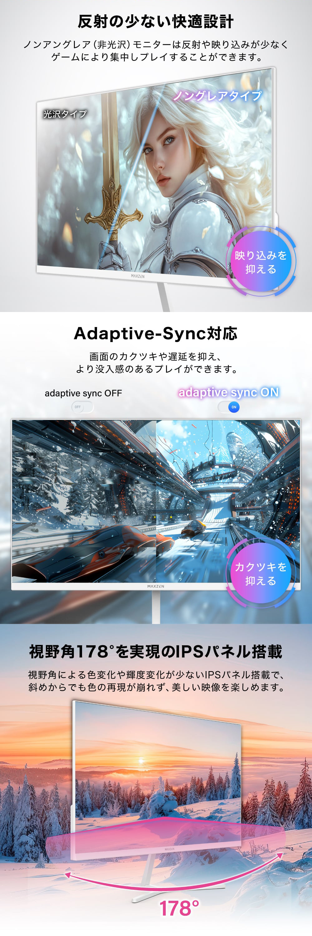 180Hzの高リフレッシュレートにより、 動きの速いシーンもなめらかに表示。 ゲームや映像視聴を快適に楽しめます。