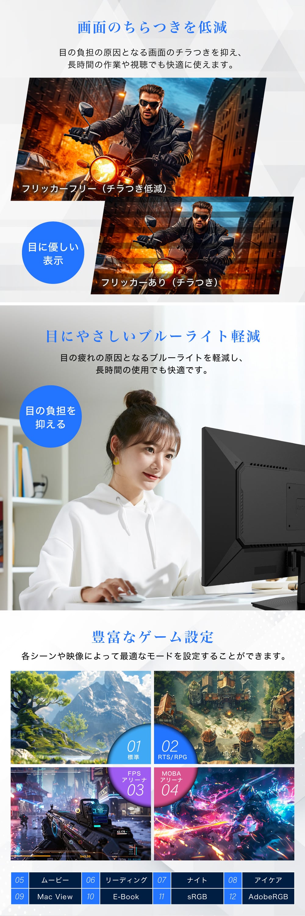 目の負担の原因となる画面のチラつきを抑え、長時間の作業や視聴でも快適に使えます。