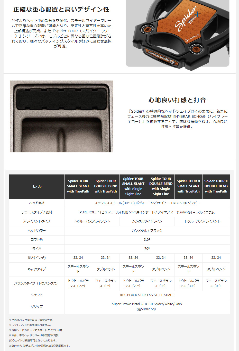 今作よりヘッド中心部分を空洞化。スチールワイヤーフレームで正確な重心配置が可能となり、安定性と寛容性を高めた上部構造が完成。また『Spider TOUR(スパイダー ツアー)』シリーズでは、モデルごとに異なる重心位置設計がされており、様々なパッティングスタイルや好みに合わせ選択が可能。