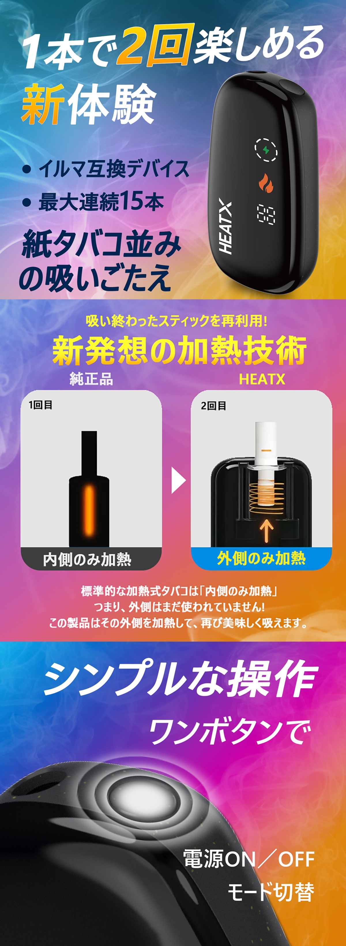 * 対応できるタバコスティック: IQOS ILUMA 専用 TEREA/SENTIA、 HEATX ノンニコチンスティック