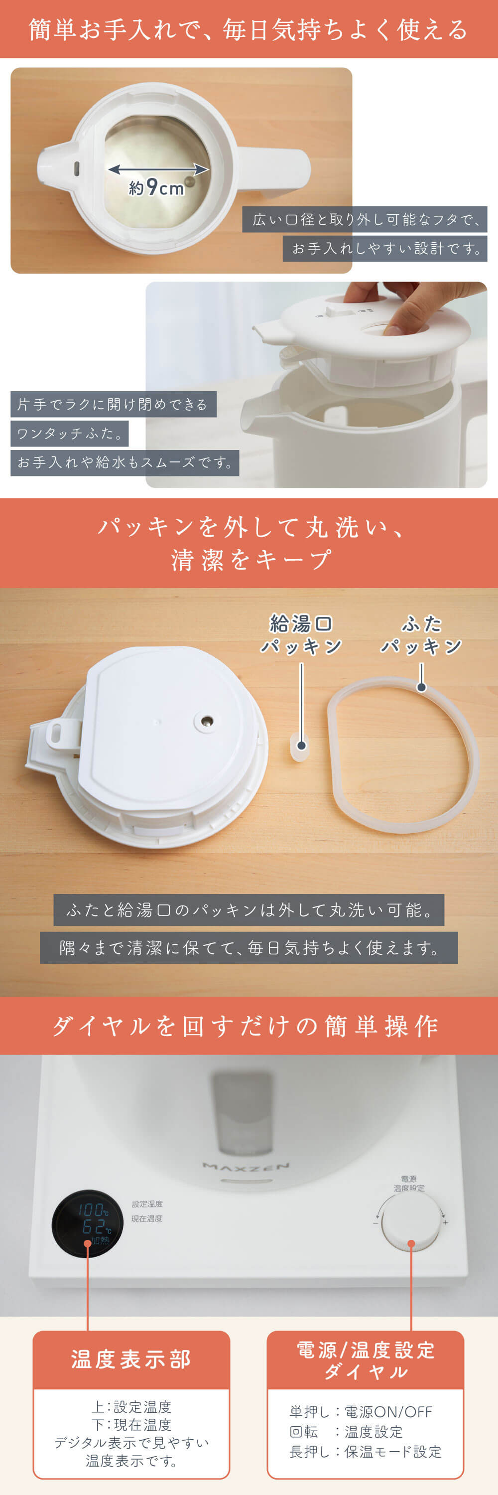 ふたと給湯口のパッキンは外して丸洗い可能。隅々まで清潔に保てて、毎日気持ちよく使えます。