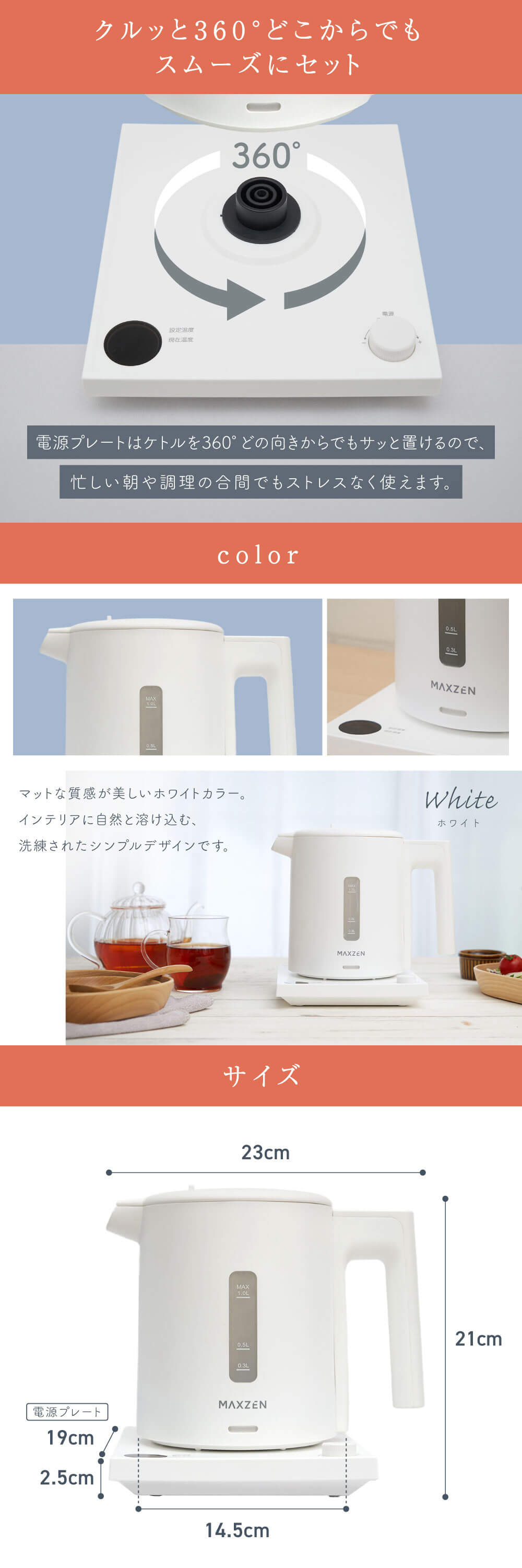 電源プレートはケトルを360°どの向きからでもサッと置けるので、忙しい朝や調理の合間でもストレスなく使えます。