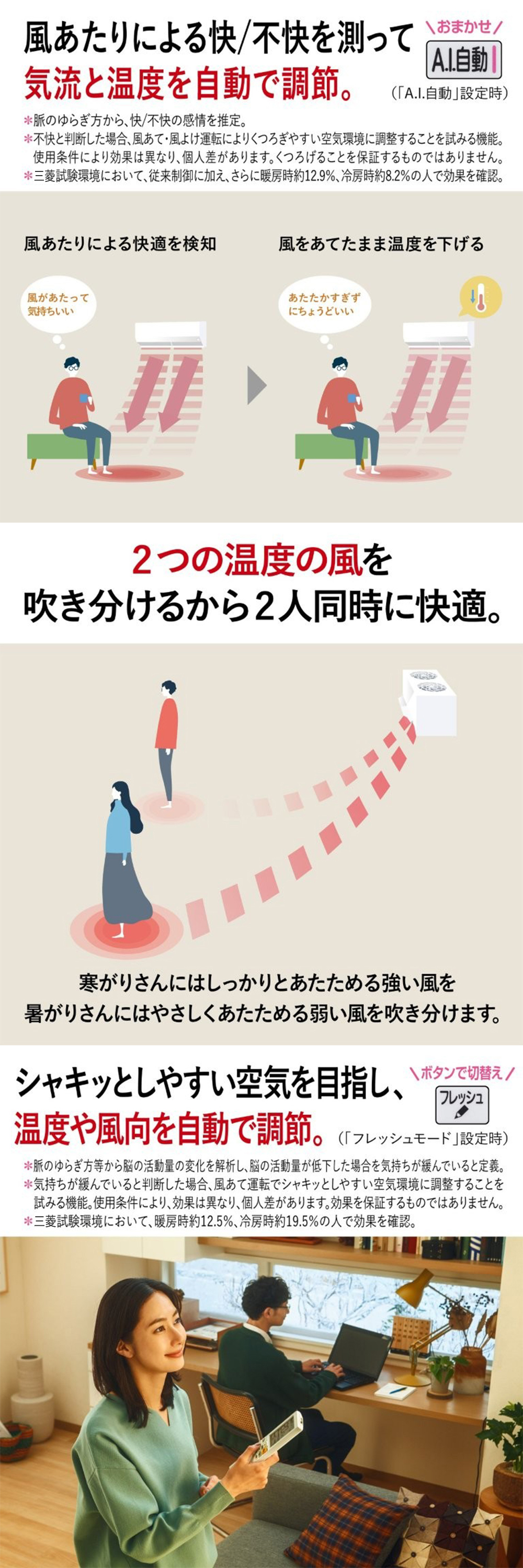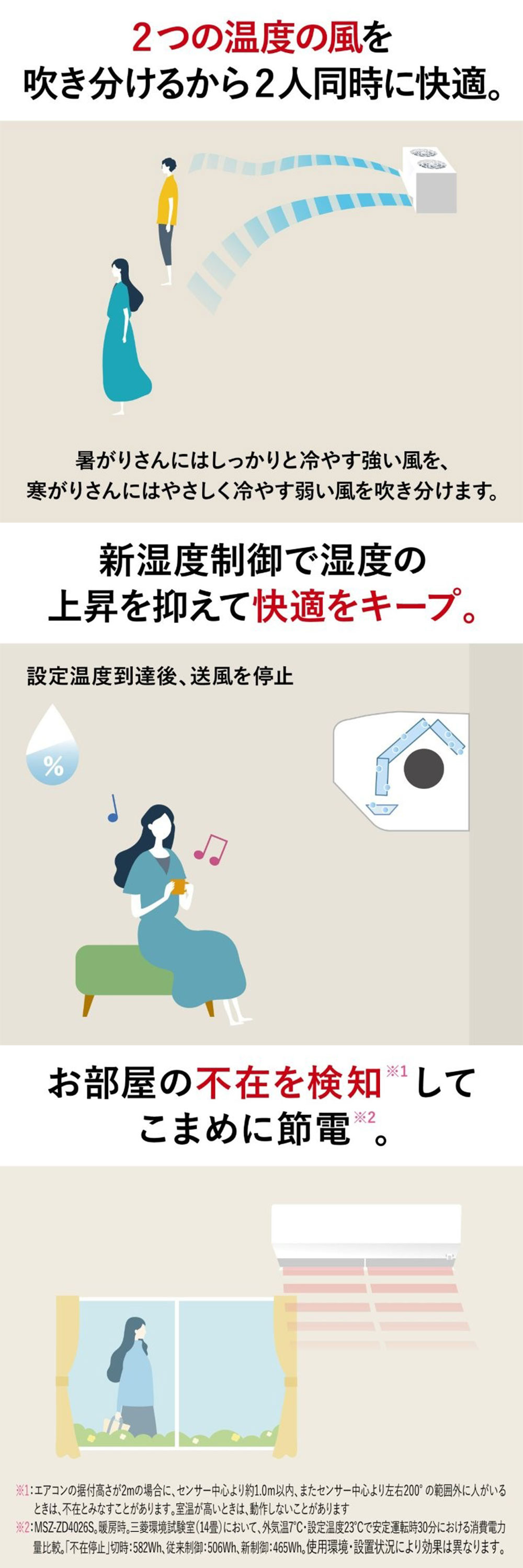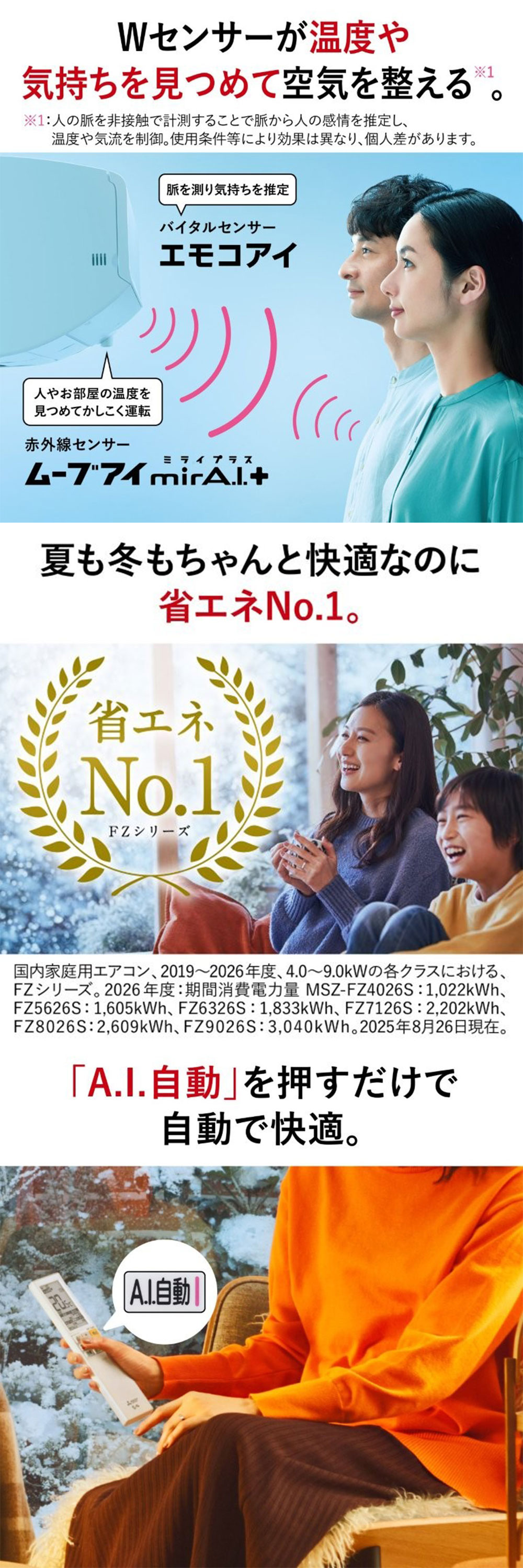 ※7:MSZ-FZ6326S・ZW4026S・FD4026S・ZD4026S。冷房/暖房時、メーカー環境試験室(20畳:FZシリーズ・14畳:Z・FD・ZDシリーズ)において、外気温35℃/7℃・設定温度27℃/23℃で不在時30分運転した場合における消費電力量比較。「不在」切時:138Wh/249Wh(FZシリーズ)190Wh/239Wh(Zシリーズ)195Wh/398Wh(FDシリーズ)210Wh/582Wh(ZDシリーズ)、従来制御:119Wh/220Wh(FZシリーズ)/165Wh/208Wh(Zシリーズ)/152Wh/363Wh(FDシリーズ)/158Wh/506Wh(ZDシリーズ)、新制御:112Wh/203Wh(FZシリーズ)/154Wh/193Wh(Zシリーズ)129Wh/337Wh(FDシリーズ)142Wh/465Wh(ZDリーズ)。使用環境・設置状況により効果は異なります。