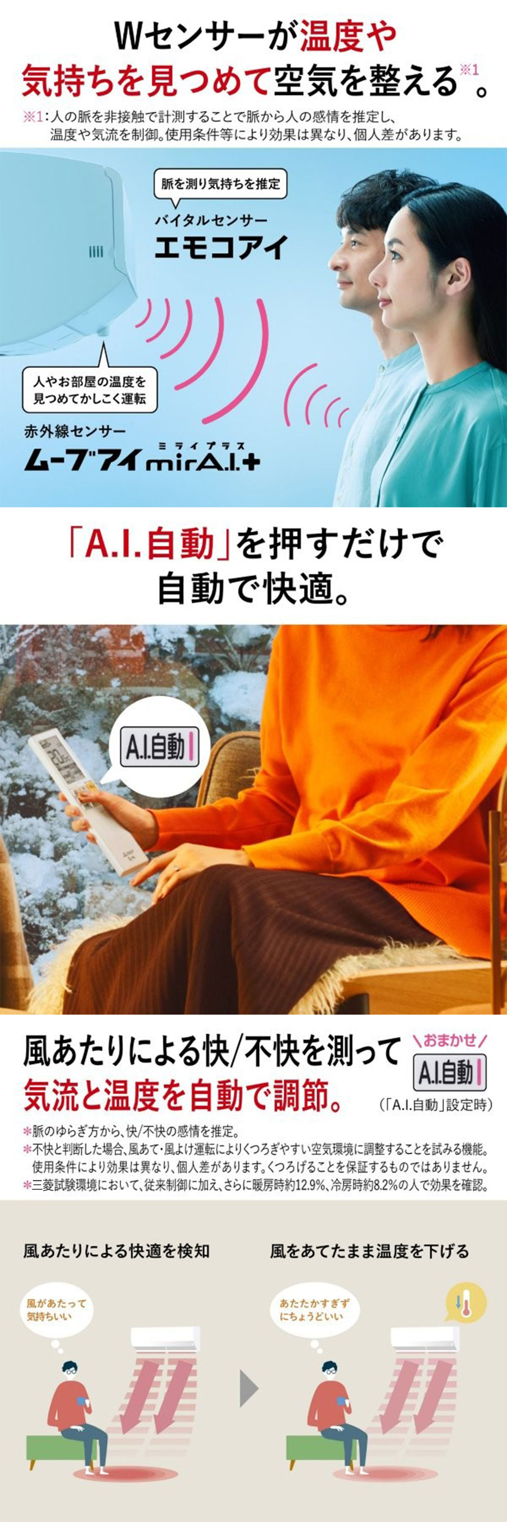 「ムーブアイmirA.I.+」が、体感温度の検知や室温の変化を予測。冷やしすぎないように、あたためすぎないように、 運転モードやオン/オフ(スタンバイ)をムダのないタイミングで自動で切り替えます。
