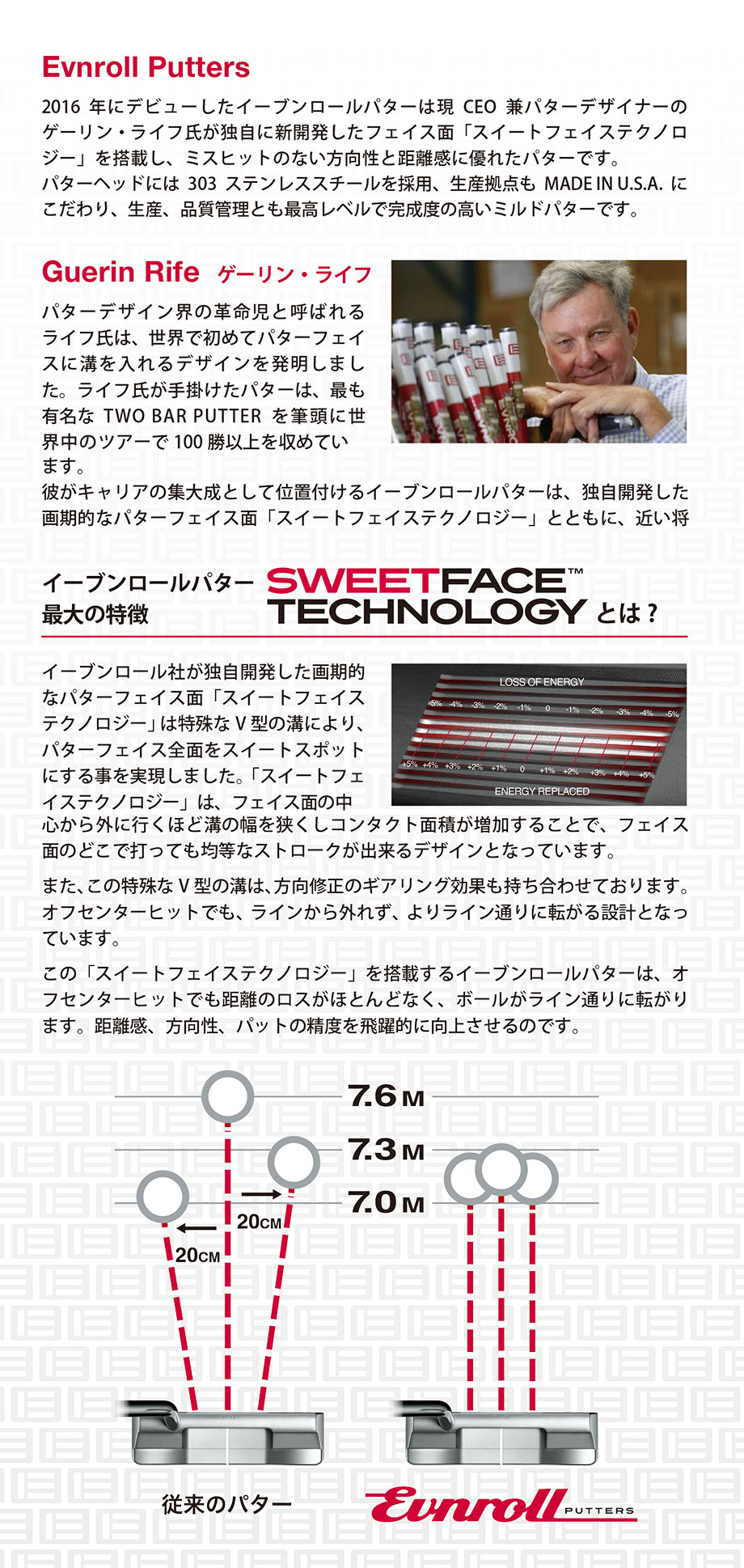 この「スイートフェイステクノロジー」を搭載するイーブンロールパターは、オフセンターヒットでも距離のロスがほとんどなく、ボールがライン通りに転がります。距離感、方向性、パットの精度を飛躍的に向上させるのです。