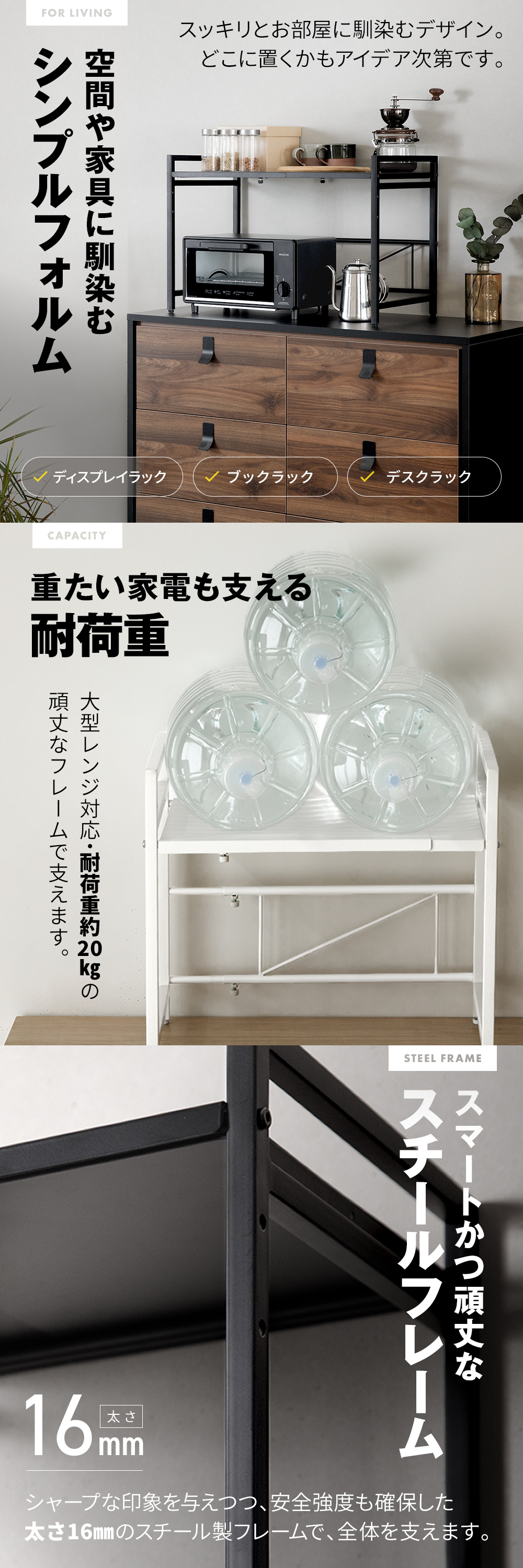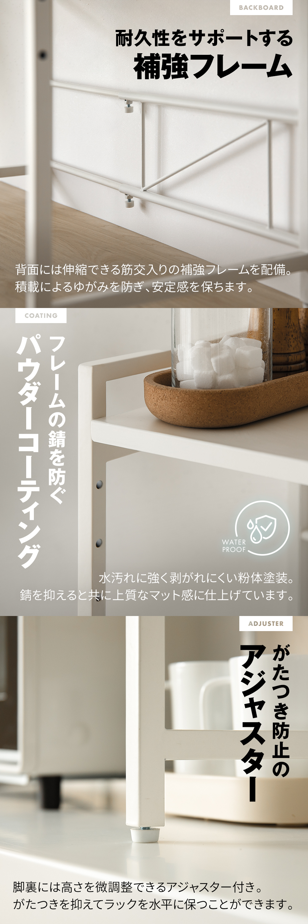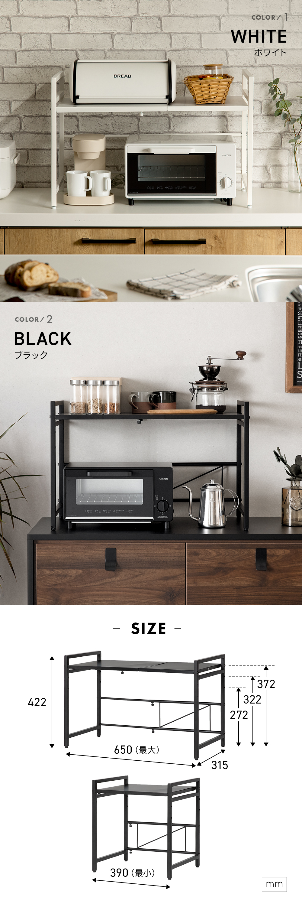 レンジやトースターはもちろん、高さのあるケトルや調理道具などに合わせて簡単に調整できます。