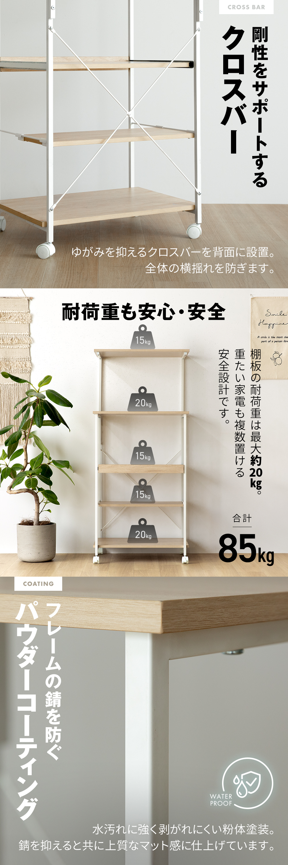棚板の耐荷重は最大約20kg。重たい家電も複数置ける安全設計です。