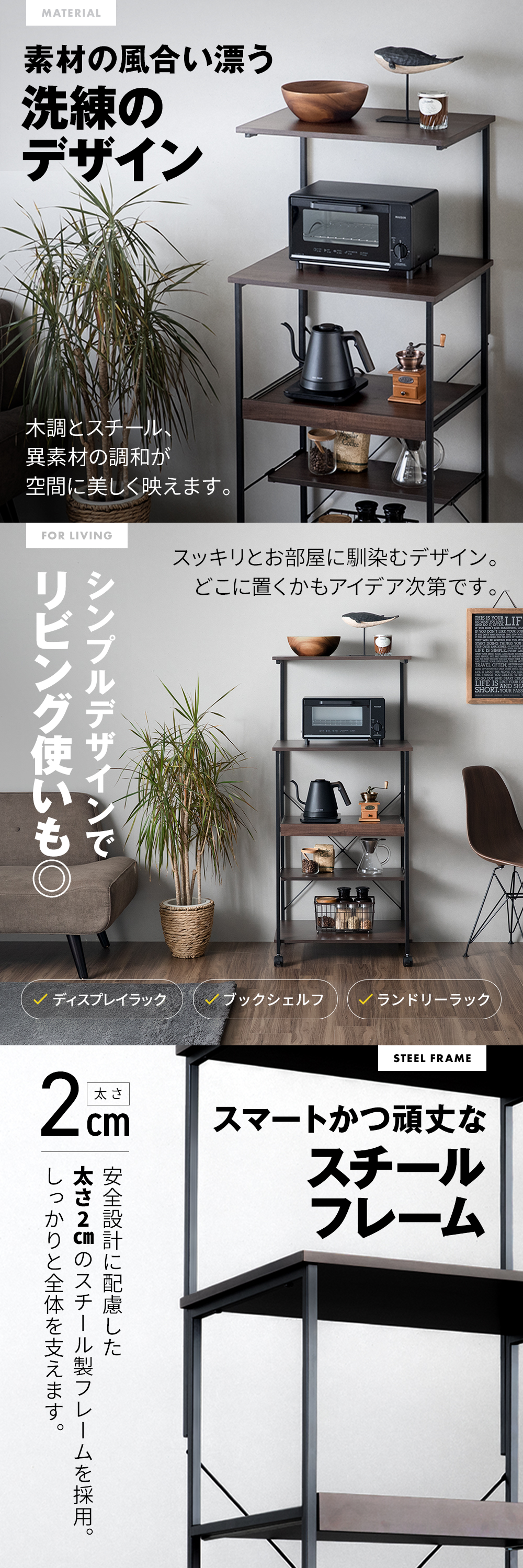 シンプルなオープン収納の中にうれしい機能美。アイテムを効率的に整理できるレンジラックです。
