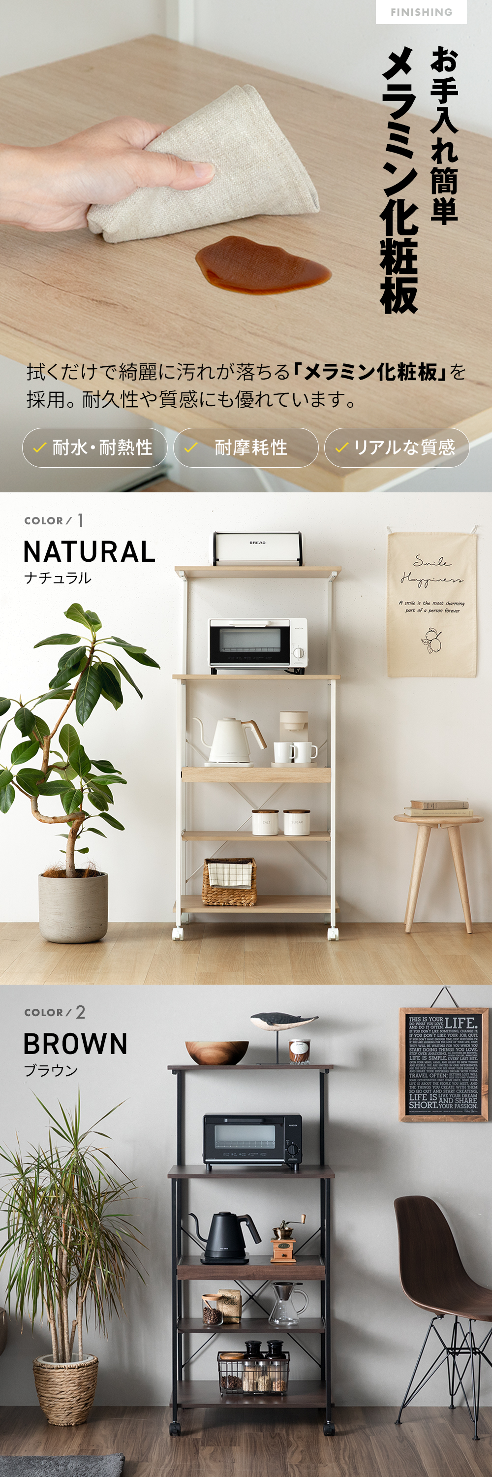 拭くだけで綺麗に汚れが落ちる 「メラミン化粧板」を採用。耐久性や質感にも優れています。
