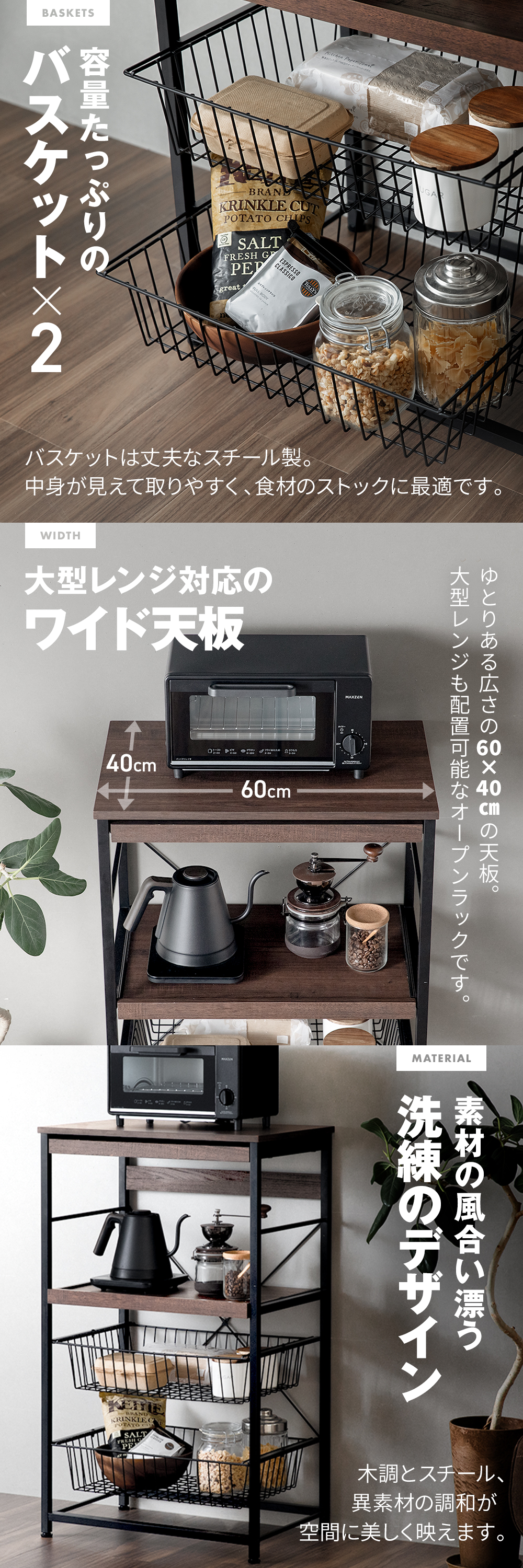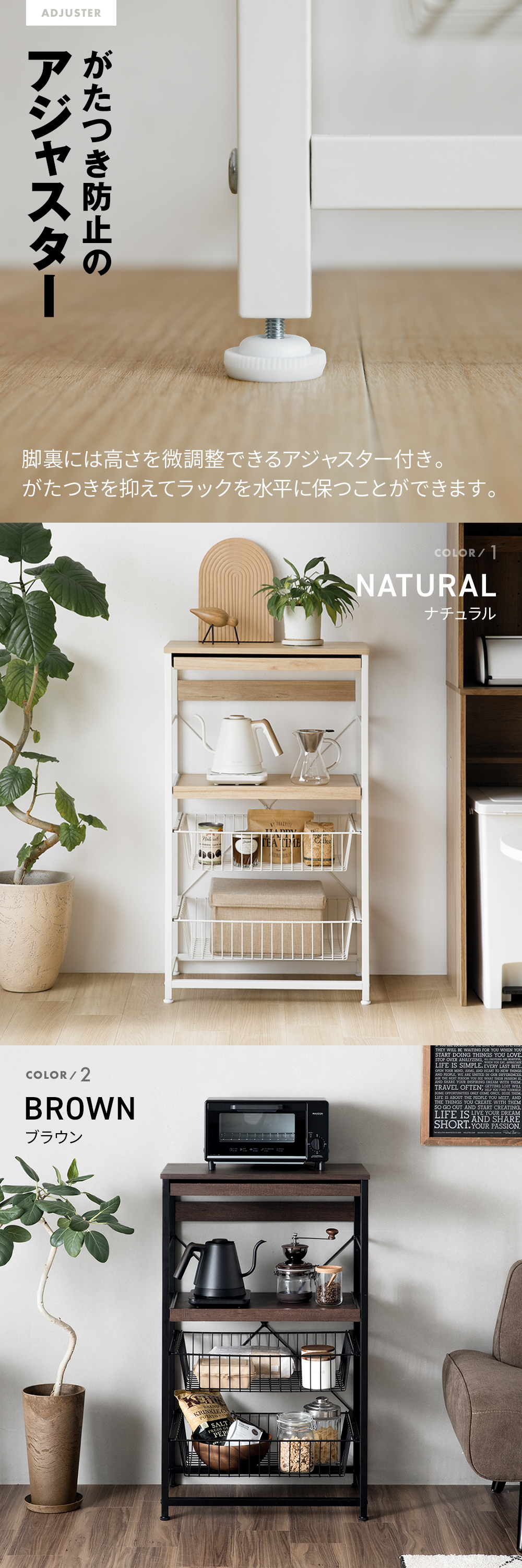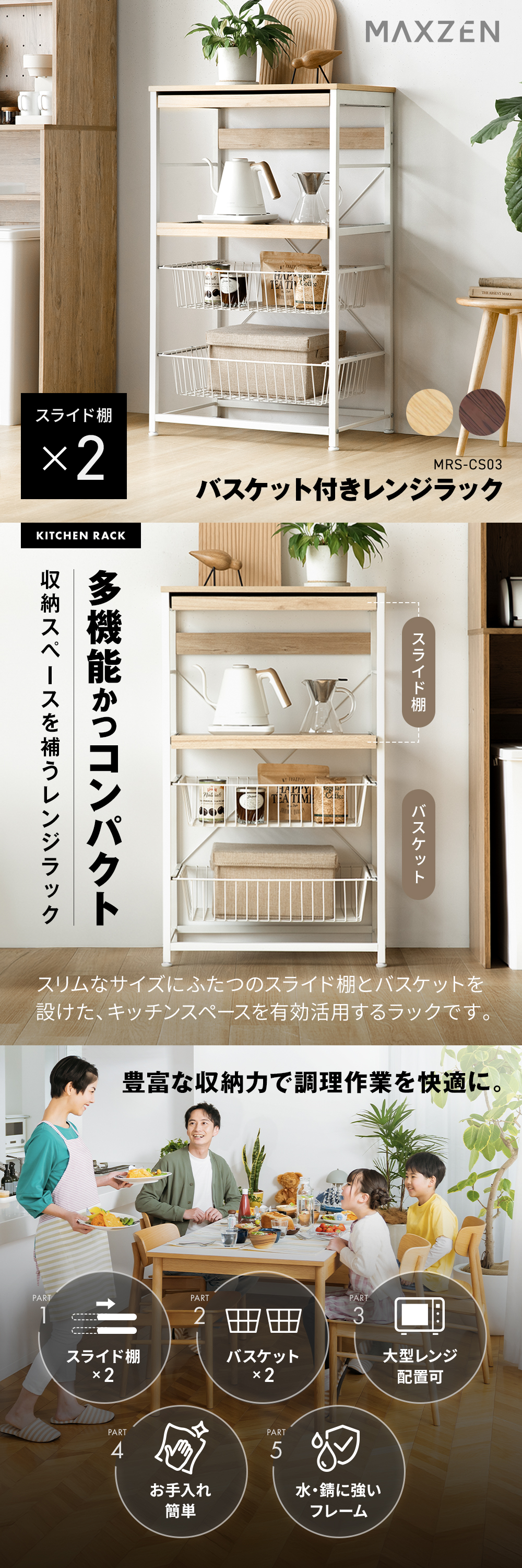 スリムなサイズにふたつのスライド棚とバスケットを設けた、。キッチンスペースを有効活用するラックです。