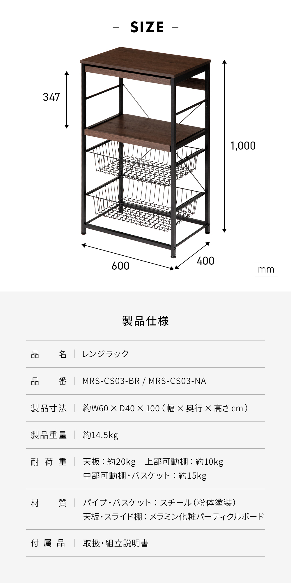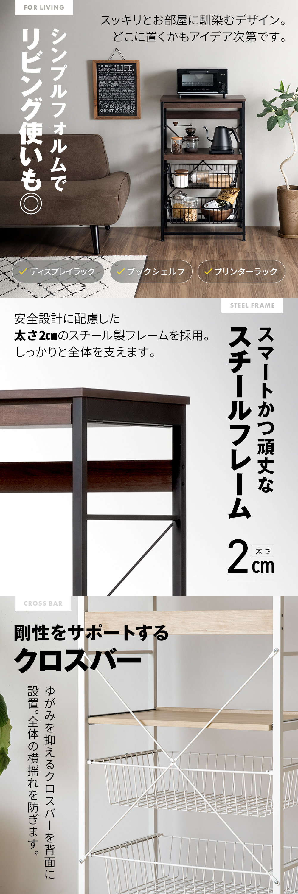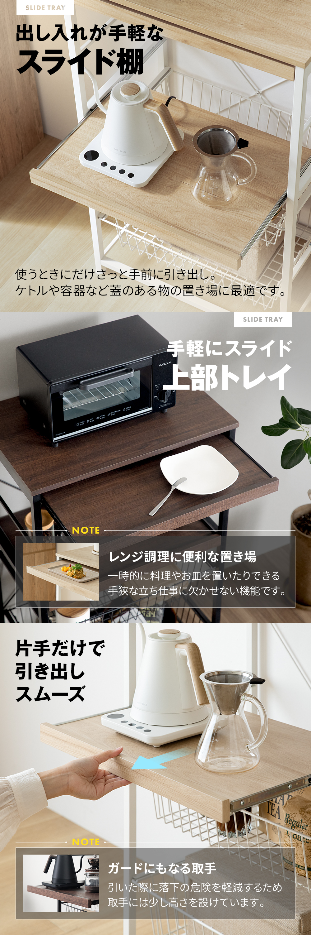 スリムなサイズにふたつのスライド棚とバスケットを設けた、。キッチンスペースを有効活用するラックです。
