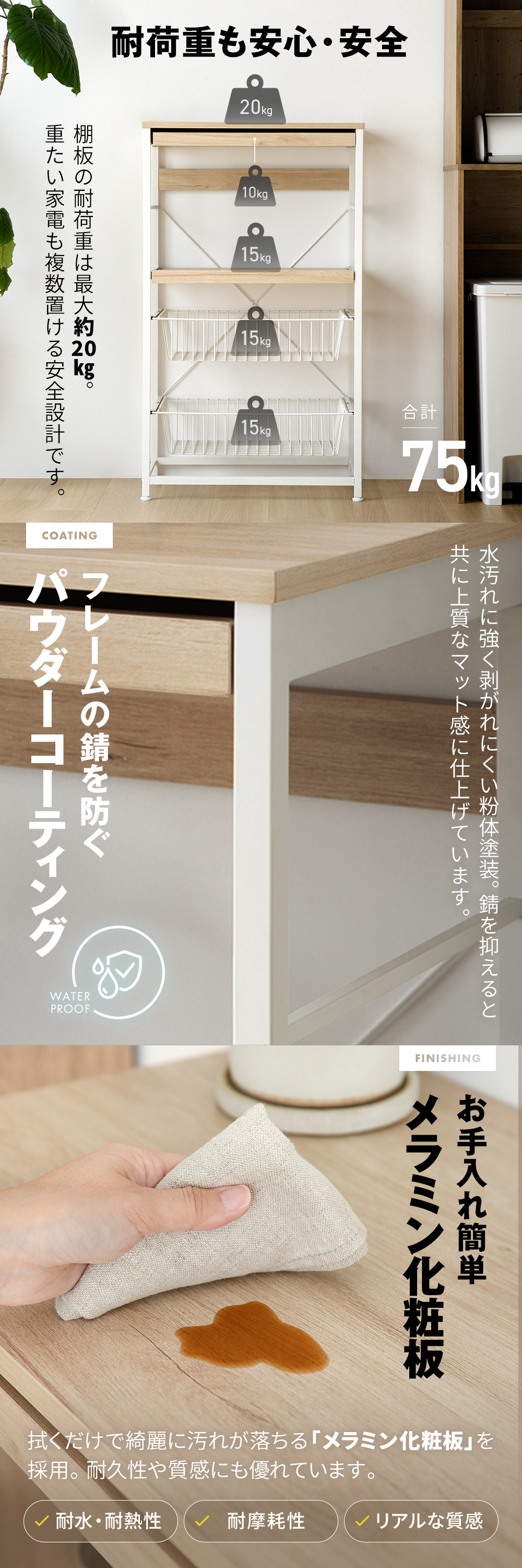 棚板の耐荷重は最大約20g。重たい家電も複数置ける安全設計です。