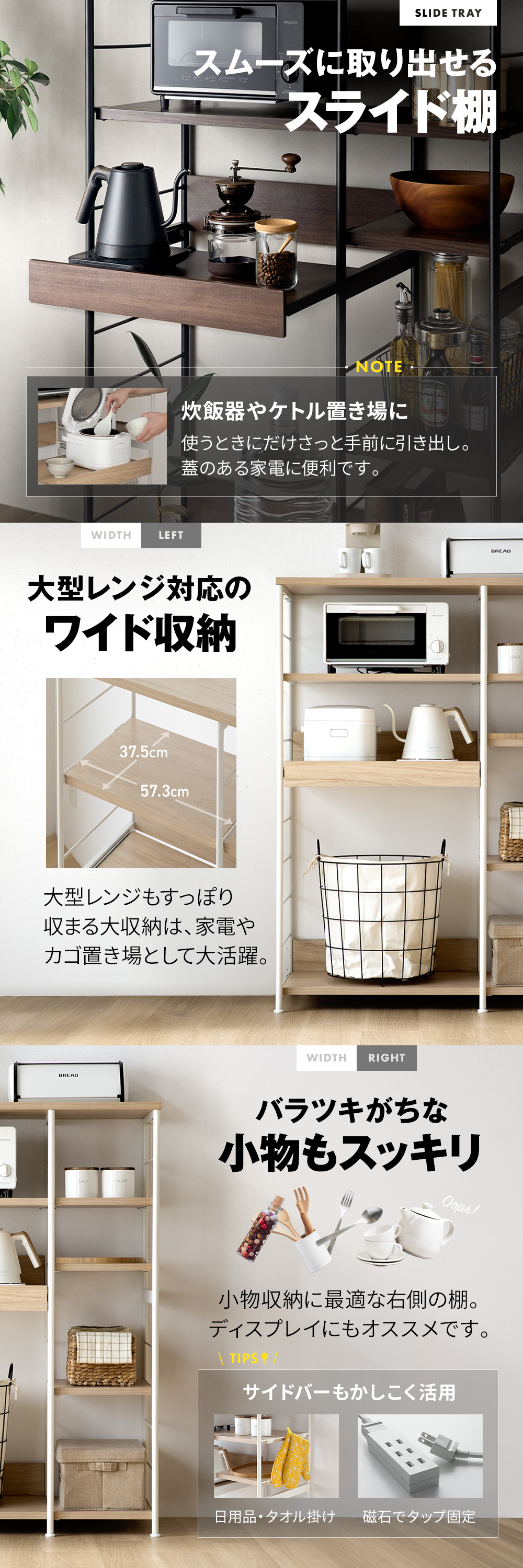使い勝手のよい幅60cmと30cmを組み合わせた、大容量で効率的に収納できるレンジラックです。