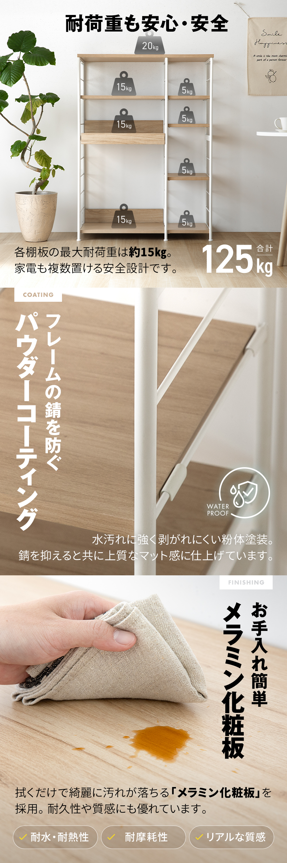 各棚板の耐荷重約15kg。重たい家電も複数置ける安全設計です。