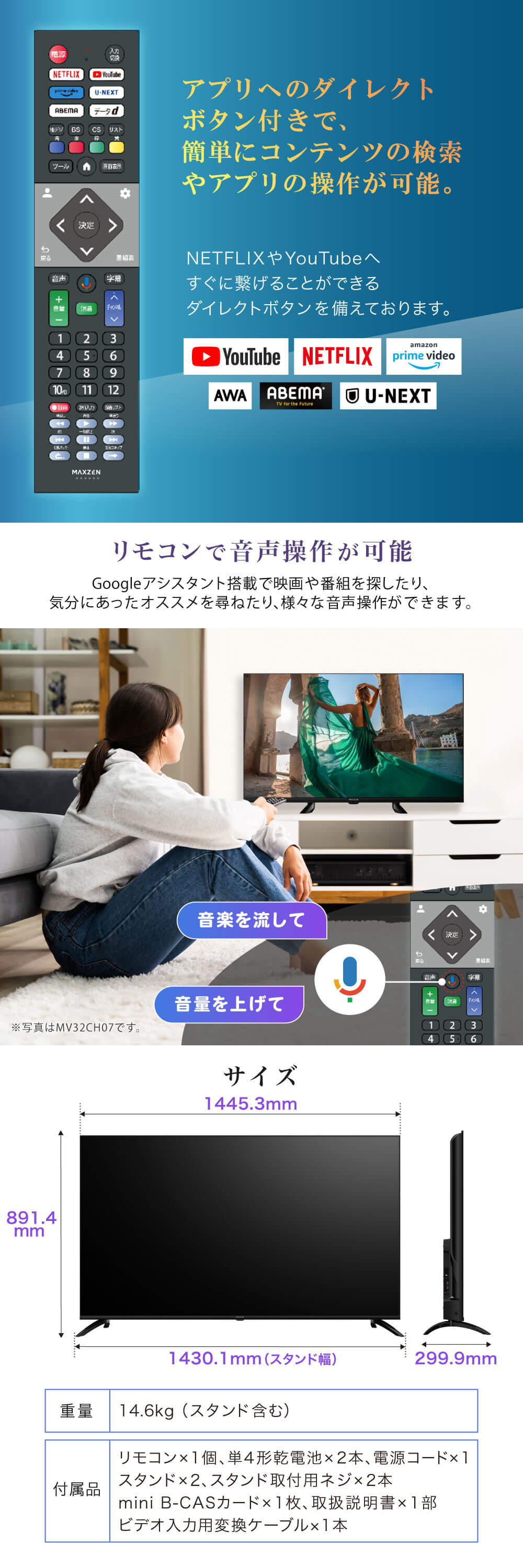 * 製品寸法(スタンド有): 1445.3×891.4×299.9mm