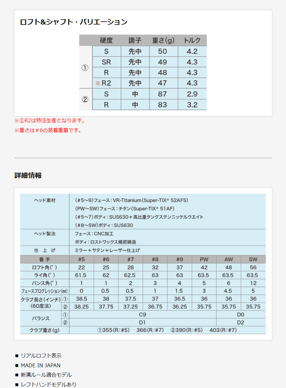 | ヘッド構造 | ボディ:SUS630(ロストワックス精密鋳造) フェース:Super-TIX(CNC加工) |