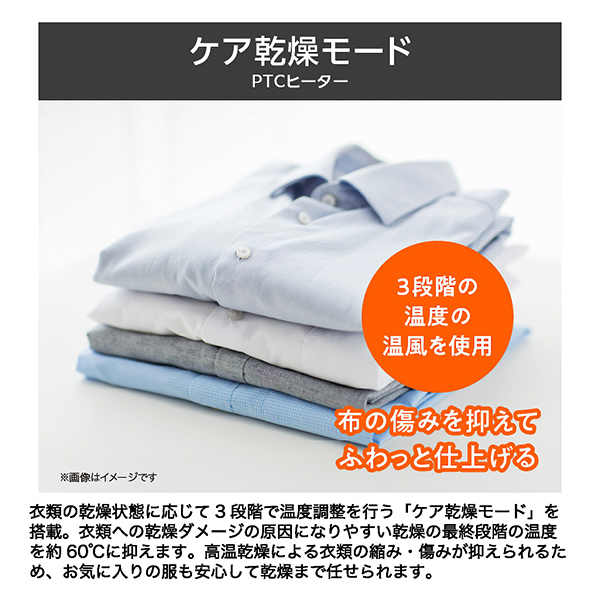 衣類の乾燥状態に応じて3段階で温度調整を行う「ケア乾燥モード」を搭載。衣類への乾燥ダメージの原因になりやすい乾燥の最終段階の温度を約60℃に抑えます。