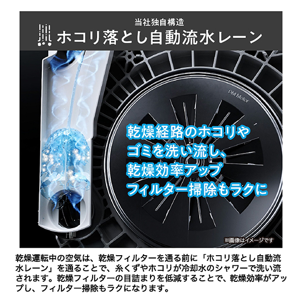 乾燥運転中の空気は、乾燥フィルターを通る前に「ホコリ落とし自動流水レーン」を通ることで、糸くずやホコリが冷却水のシャワーで洗い流されます。