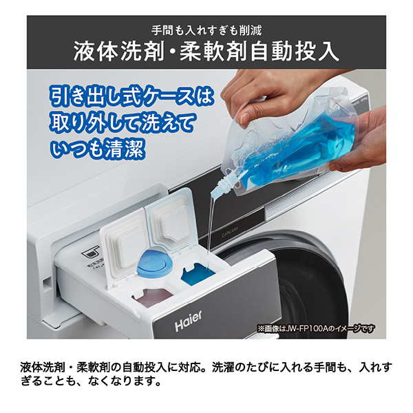 液体洗剤・柔軟剤の自動投入に対応。洗濯のたびに入れる手間も、入れすぎることも、なくなります。