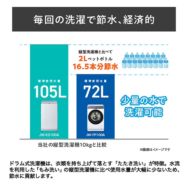 ドラム式洗濯機は、衣類を持ち上げて落とす「たたき洗い」が特徴。水流を利用した「もみ洗い」の縦型洗濯機に比べ使用水量が大幅に少ないため、節水に貢献します。