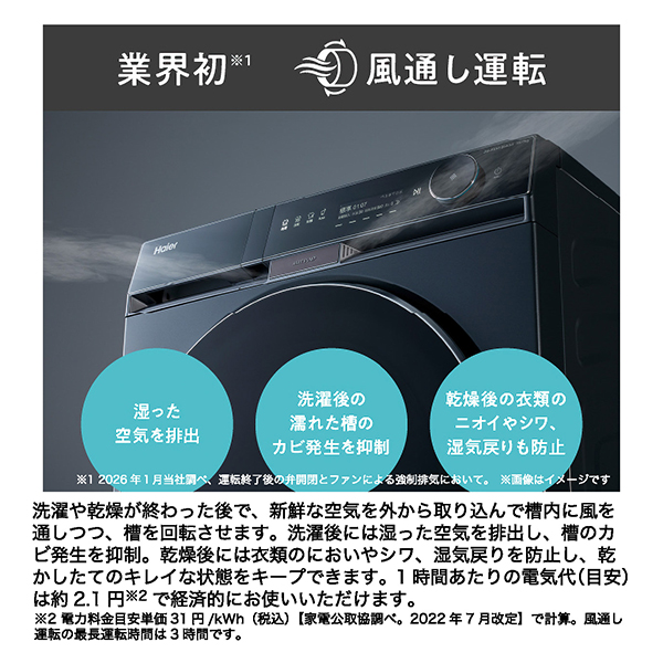 洗濯後には湿った空気を排出し、槽のカビ発生を抑制。乾燥後には衣類のにおいやシワ、湿気戻りを防止し、乾かしたてのキレイな状態をキープできます。