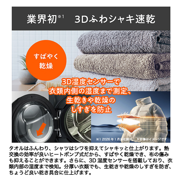 さらに、3D湿度センサーを搭載しており、衣類内部の湿度まで検知。分厚い衣類でも、生乾きや乾燥のしすぎを防ぎ、ちょうど良い乾き具合に仕上げます。