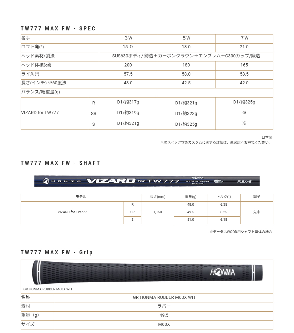 【日本正規品】 ホンマ TW777 MAX フェアウェイウッド 2026年モデル VIZARD for TW777 15 S