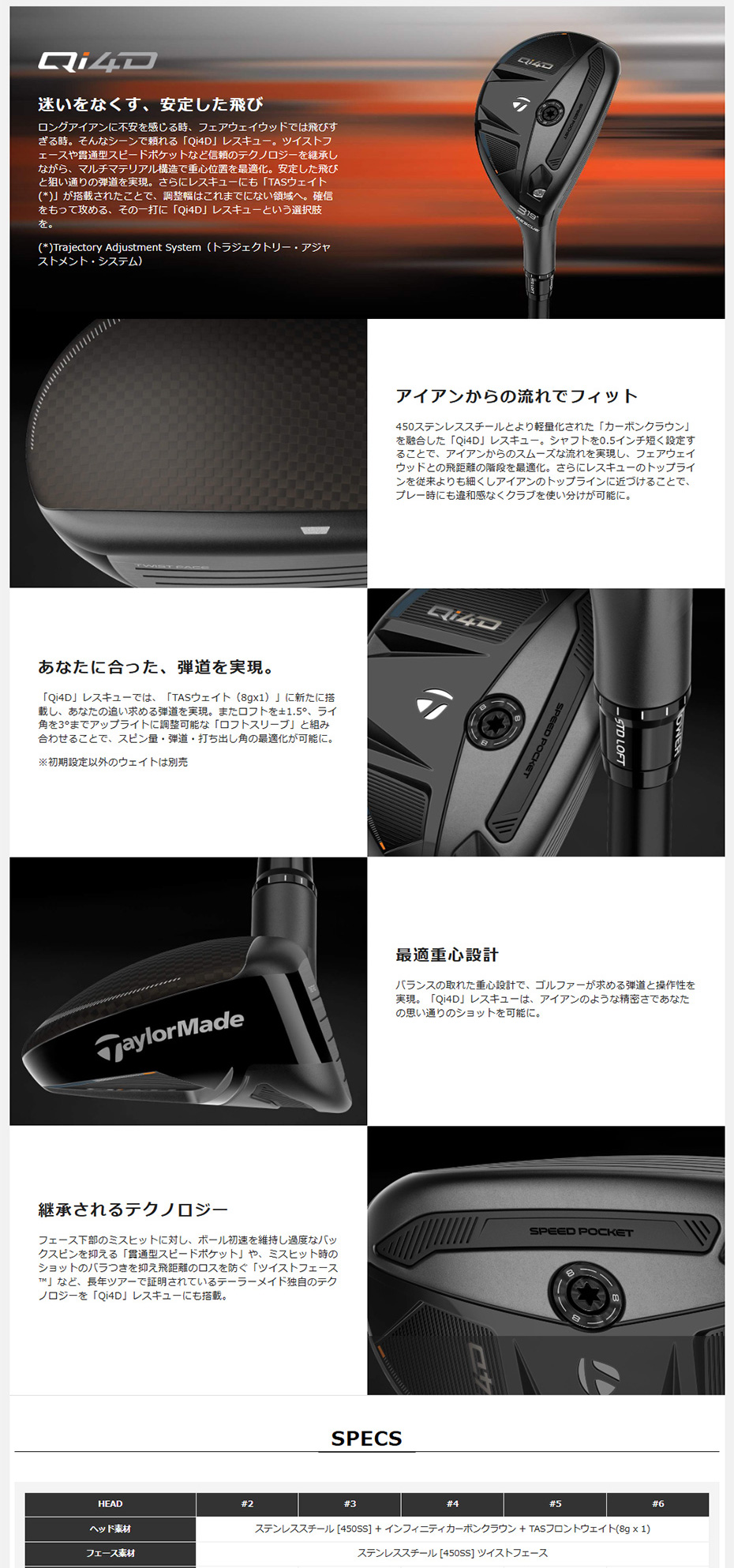 フェース下部のミスヒットに対し、ボール初速を維持し過度なバックスピンを抑える「貫通型スピードポケット」や、ミスヒット時のショットのバラつきを抑え飛距離のロスを防ぐ「ツイストフェース」など、長年ツアーで証明されているテーラーメイド独自のテクノロジーを「Qi4D」レスキューにも搭載。