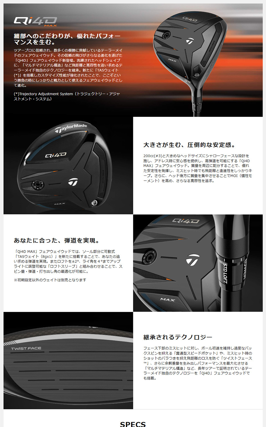 フェース下部のミスヒットに対し、ボール初速を維持し過度なバックスピンを抑える「貫通型スピードポケット」や、ミスヒット時のショットのバラつきを抑え飛距離のロスを防ぐ「ツイストフェース」、さらに余剰重量を生み出しパフォーマンスを最大化させる「マルチマテリアル構造」など、長年ツアーで証明されているテーラーメイド独自のテクノロジーを「Qi4D」フェアウェイウッドでも搭載。