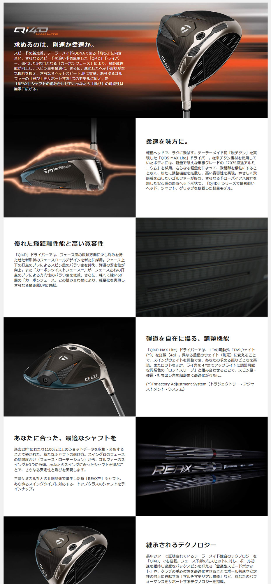 スピードの新定義。テーラーメイドのDNAである「飛び」に向き合い、さらなるスピードを追い求め誕生した「Qi4D」ドライバー。進化した5代目となる「カーボンフェース」により、飛距離性能が向上し、スピン量も最適化。さらに、進化したヘッド形状が空気抵抗を抑え、さらなるへッドスピードUPに貢献。あらゆるゴルファーの「飛び」をサポートする4つのモデルに加え、新「REAX」シャフトの組み合わせで、あなたの「飛び」の可能性は無限に広がる。