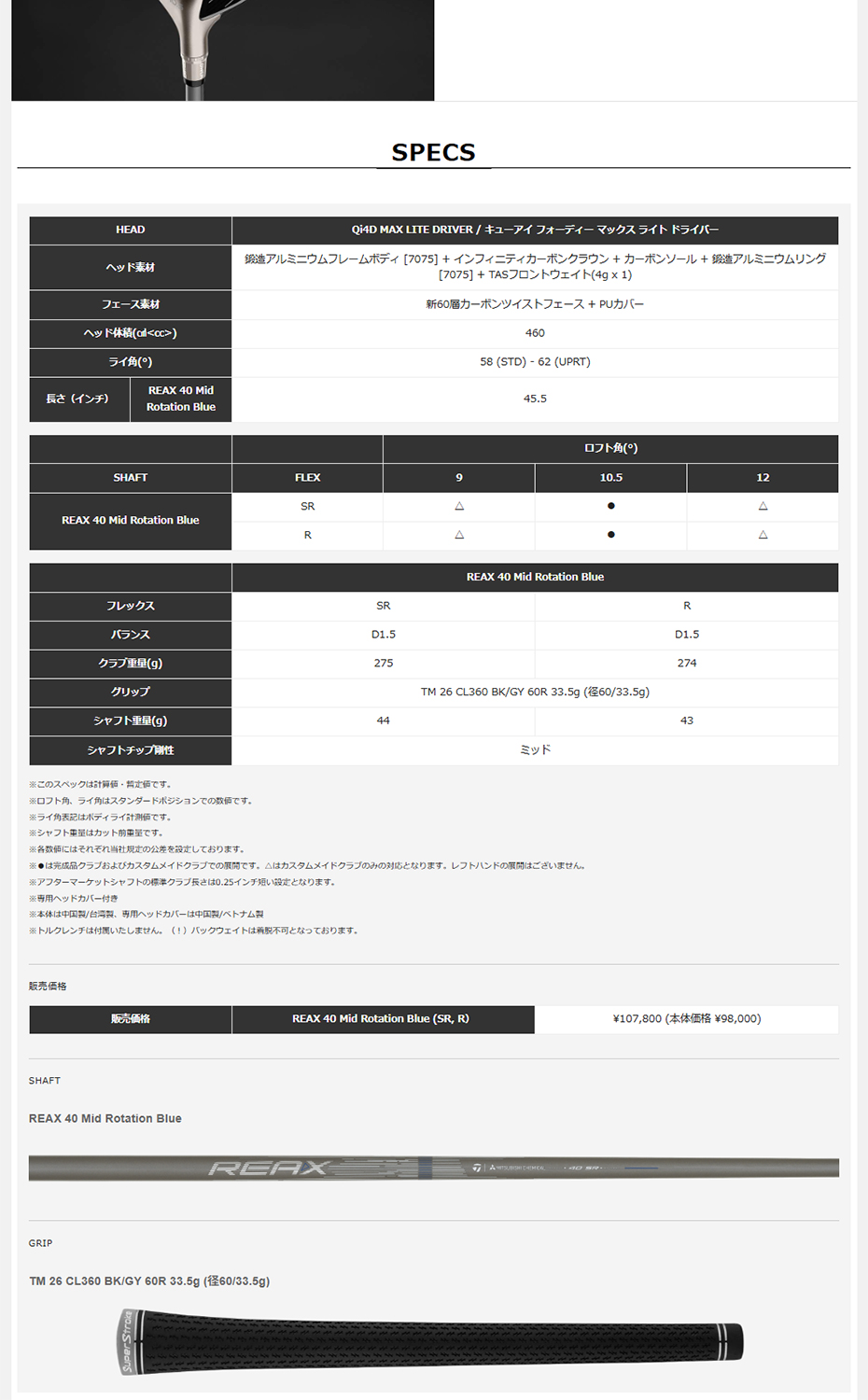 【日本正規品】 テーラーメイド Qi4D Max Lite ドライバー 2026年モデル REAX MR 40 10.5 SR