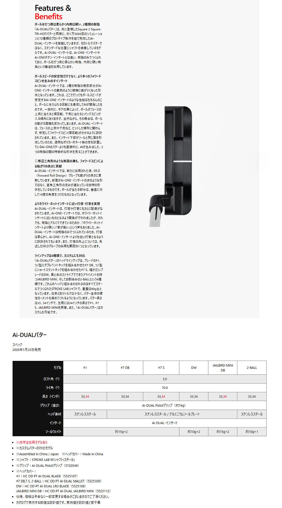 「Ai-DUALパター」のヘッドラインアップは、ブレードの#1、ツノ型にダブルベントネックを組み合わせた#7 DB、ツノ型にショートスラントネックを組み合わせた#7 S、幅が広いブレードのDW、黒と白のストライプでできたアライメントを持つJAILBIRD MINI、そしてお馴染みの2-BALLという6種類です。