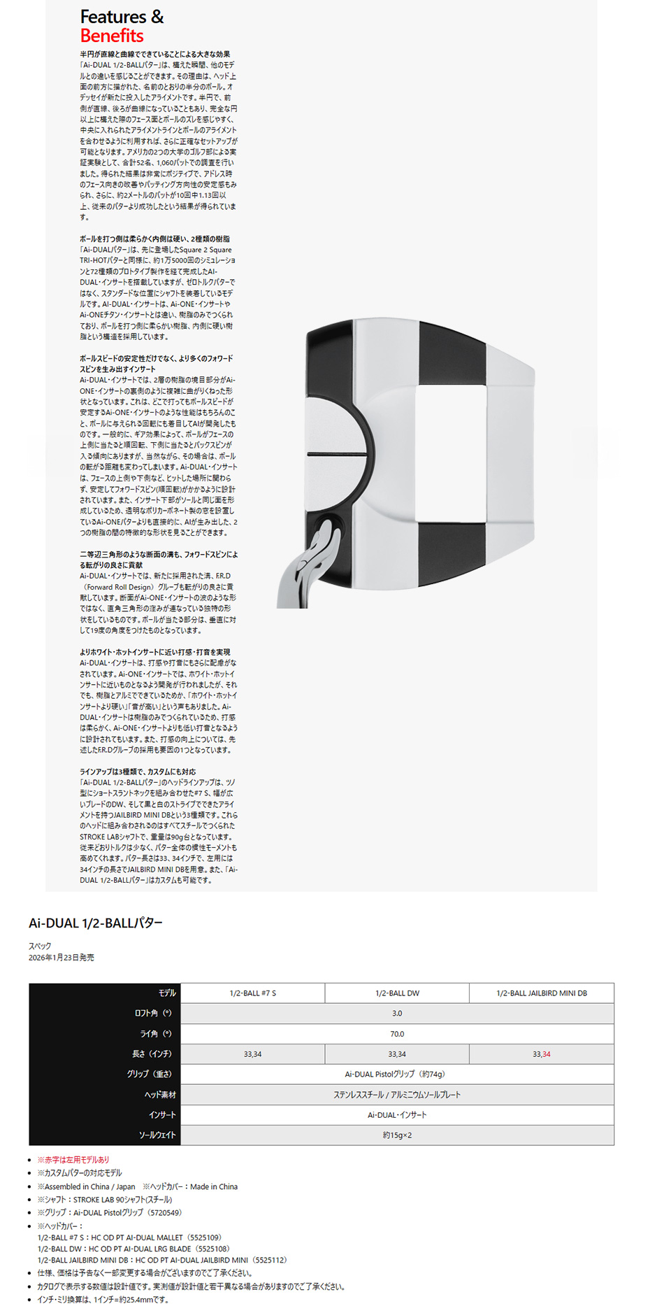 従来どおりトルクは少なく、パター全体の慣性モーメントも高めてくれます。パター長さは33、34インチで、左用には34インチの長さでJAILBIRD MINI DBを用意。