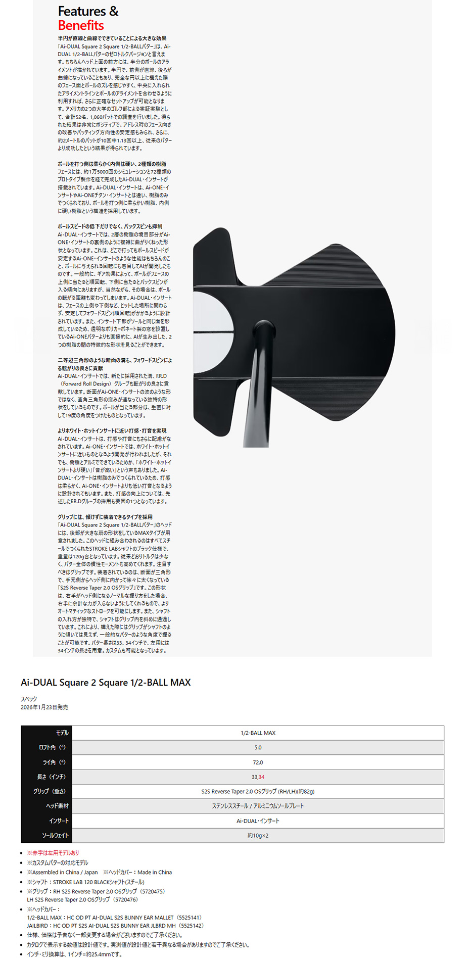 「Ai-DUAL Square 2 Square 1/2-BALLパター」のヘッドには、後部が大きな扇の形状をしているMAXタイプが用意されました。このヘッドに組み合わされるのはすべてスチールでつくられたSTROKE LABシャフトのブラック仕様で、重量は120g台となっています。従来どおりトルクは少なく、パター全体の慣性モーメントも高めてくれます。