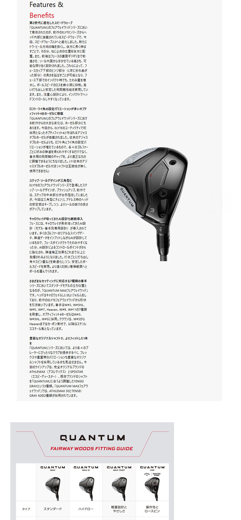 今回のラインアップは、完全オリジナルブランドのATHLEMAX(アスレマックス)とSPDSTAR(エスピーディースター)、既存ブランドのシャフトを「QUANTUM」に合うよう調整したTENSEI GRAYという3種類。「QUANTUM MAXフェアウェイウッド」では、ATHLEMAX 50とTENSEI GRAY 60の2種類が採用されています。
